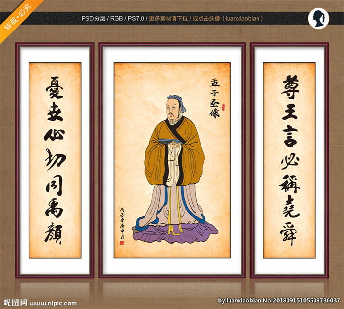 孟子简介:孟子(约公元前372年—公元前289年),名轲,字子舆,邹国(今山东邹城东南)人。战国时期哲学家、思想家、教育家,是孔子之后、荀子之前的儒家学派的代表人物,与孔子并称“孔孟”。孟子宣扬“仁政”,最早提出“民贵君轻”思想,被韩愈列为先秦儒家继承孔子“道统”的人物,元朝追封为“亚圣”。