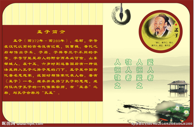 孟子简介(下):孟子早年受业于子思(孔伋,孔子之孙)之门人。他对孔子尊崇备极,是位非常有抱负的政治家。与孔子一样,孟子一生也过着长期的私人讲学生活。中年以后怀着政治抱负,带着学生周游列国,推行他的政治主张,随从学生最盛的时候,是"后车数十乘,从者数百人"。晚年回到故乡,从事教育和著述。