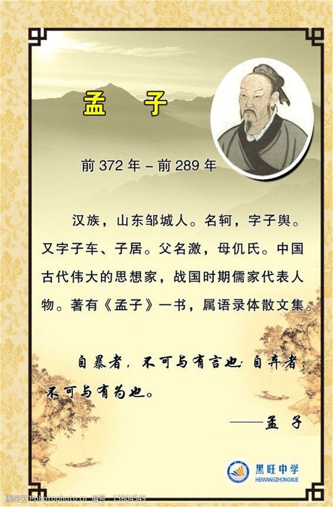 孟子简介(上):孟子(公元前372年—公元前289年),名轲,字子舆,邹国(今山东邹城东南)人。战国时期哲学家、思想家、教育家,是孔子之后儒家学派的主要代表人物,与孔子并称“孔孟”。孟子宣扬“仁政”,最早提出“民贵君轻”思想,被列为先秦儒家继承孔子“道统”的人物,元朝追封为“亚圣”。