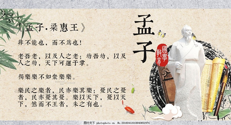 孟子简介(下):孟子早年受业于子思(孔伋,孔子之孙)之门人。他对孔子尊崇备极,是位非常有抱负的政治家。与孔子一样,孟子一生也过着长期的私人讲学生活。中年以后怀着政治抱负,带着学生周游列国,推行他的政治主张,随从学生最盛的时候,是"后车数十乘,从者数百人"。晚年回到故乡,从事教育和著述。