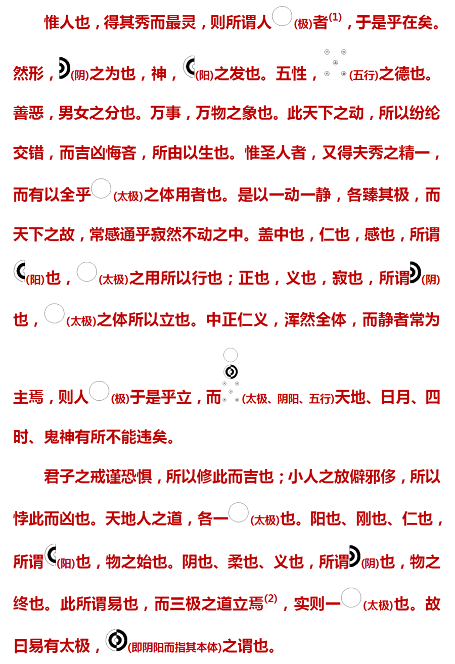 (2)三极:天、地、人各具一太极,称为三极。“立天之道曰阴与阳,立地之道曰柔与刚,立人之道曰仁与义,是谓三才之道,即太极也。是故六爻之动,而三极之道见乎其中。盖天地与人,各具一太极也。”(《周易卦解·圣人章》)