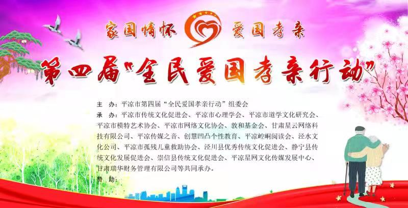 平凉市第四届“全民爱国孝亲行动”从6月上旬开始,已经举行了“永远跟党走”教育实践行动、“爱国孝亲”人物寻访行动、“爱国孝亲”家训家规家谱有奖征集行动、“爱国孝亲”成人书法暨少儿书画比赛等分项系列活动,正在和即将举行“美德讲堂”走基层宣讲行动、“爱国孝亲”乡村家校同建行动、重阳节庆典暨“爱国孝亲”颁奖典礼等分项系列活动。