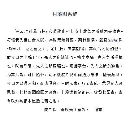 系曰:上页即秦氏官门口之祖坟图也。春露秋霜,云礽起怵凄之感;僾见忾闻,宗庙动孝敬之思;水源木本,知渊源之有自;左昭右穆,审世代之次列。仰见,群蒿凄怆,咸曰神之格思;俯献柤豆馨香,恭维享于克诚。总坟墓湮于野草,而良心讵付东流哉!况我秦氏子孙繁衍,皆先世之积德所致,是春秋祭扫,乃事之最棨重者,可不兢兢以为诸事之先乎!