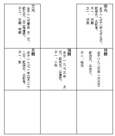 兄讳汝川,字济哉,秉性聪颖良善,勤俭宽厚,有气力。小时读书四十日,即辍学作童工。后以自学识字,能任会计事。家寒苦,能自勤力畎亩,渐致富裕。仰事俯畜,自给有余。十六七岁时,负重可二百斤,作佣,日刈获三亩。农忙时,鸡鸣而起,夜分而寝,不以为劳。土改时,膺地主罪名,历尽艰辛。兄代人和厚宽恕,与人无争,平易近人,而人多与之交。好武艺,常练刀剑拳击,而未尝与人搏斗。友于兄弟,对齐友爱深挚,常运粟百里之外,得利即为齐置衣服书籍等。齐读书平师时,计日送面给费。伊后在家读书,唯恐家人以冘务妨功。齐之所以有今日者,仲兄之力居多。先考没时,嘱不肖等树碑先茔,表扬幽德。戊子岁,兄赶牛车抵太峒山运石,路险坡陡,受尽惊悸,未及请文镌字,而家庭多事,迁延岁月,后则贞砥竟付无有矣。其后生计拮据,家境穷迫。至一九六零年,旱魃为虐,国课完后所余无几,菜根树皮,佐佑饔飧,乃兄于冬月朔,溘然辞世矣。距生于光绪二十二年丙申四月十二日,寿六十有六。葬礼未备,齐时在兰,未得抚棺含殓,抱恨终天,夫复何言!配苏儒人,子三,长上达,次长谊(出),季长民,俱业农。女二,适单、适薛。苏嫂一九六一年病殂,寿六秩,与兄葬于庄科新茔,辛山乙向。