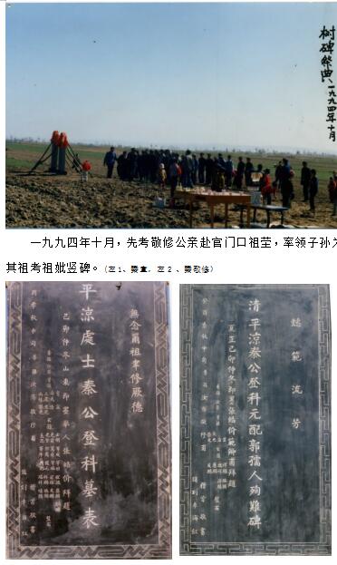 公讳颖长,世居平凉中原秦家庄。幼读诗书,习文艺。既而陇上乱起,董志原成为回夷贼窟,泾平地区常遭屠杀抢劫。同治六年腊月十二日,回匪攻破村窨,其祖父及其父母皆戕于贼。翌日公自腰崖归,惊痛几绝。收其祖及父母尸,葬于于官门口祖茔,癸山丁向。时公方十六岁,度家中不可安居,遂从其祖母避难,寄居其姑母崇信梁氏家。乱平后返里,祖母一病不起,遗公兄弟等皆幼弱,未习农事,亦无理财之术与治家之法,兼国家有事西域,赋徭繁重,所有良田鞠为茂草,无有收入,从此年年月月,常在悍吏逐求之中矣。越十余岁,田产破散几尽,遂各自谋生。公有子女六人,八口之家一人抚养,衣食支用难以自给,艰难困苦备尝之矣。晚年家给稍裕,不幸丧偶,不再娶。生平遭遇实为可悲。公卒于民国七年冬十一月,生于道光二十九年,享寿六十又九,葬于官门口祖茔。配张孺人,泾川党原百顷张家之女也。生于富骄而能安贫守约自甘穷苦,以勤俭慈惠见称,先公十二年卒,享年五十又七,葬于官门口祖茔。公有丈夫子五人,曰汝根、汝辉、汝升、汝蔕、汝曏。女一适谢氏。孙男五人,曰秀、曰实伯出;曰发、曰尚德、曰尚武仲出。女孙四,适章村史氏、适刘家沟刘氏、适王家咀王氏伯出;适四坡景氏季出。