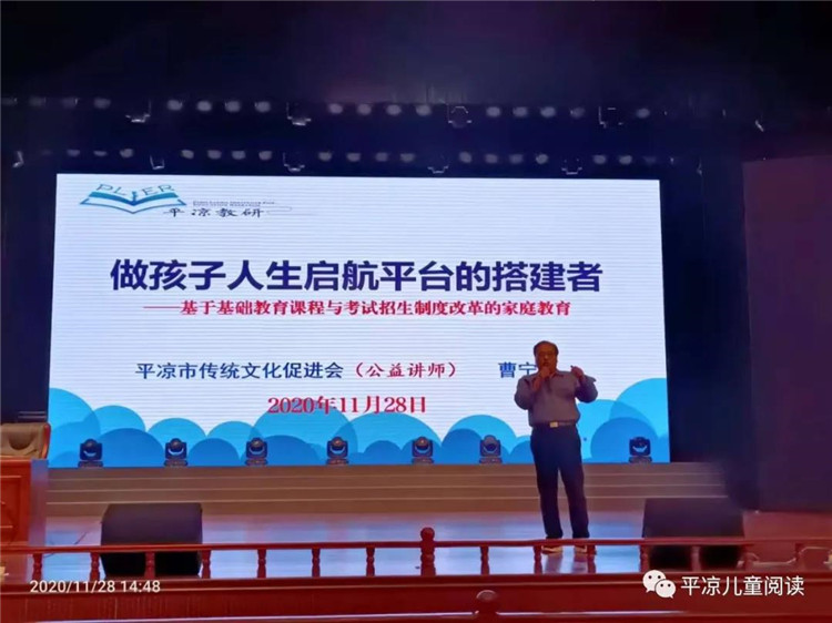 平凉美德讲堂讲师、平凉市教科所所长曹宁子做了家庭教育讲座:《基于课程教学与高考综合改革的家庭教育——做孩子人生启航平台的搭建者》。他的讲座高屋建瓴,思想深邃,立足家校融合,全面落实立德树人的根本任务,聚焦孩子的全面发展、综合素质、核心素养,从宏观层面论述了课程改革和高考改革下的家庭教育。指出家庭是孩子人生的奠基石,家庭教育对孩子的成长有着至关重要的作用。