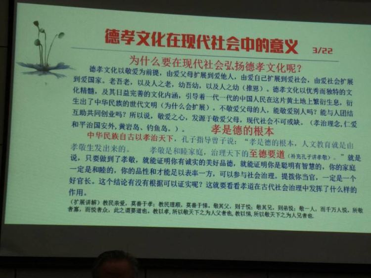 秦治先生围绕“推崇孝道、做好自己、教育子女、塑造和乐家庭、学习圣贤教育理念、让你的子女完美成长”等主题,通过“德孝文化是复兴优秀传统文化的着力点,孝道是品德养成的根本,孝与德相益相成,德孝文化在现代社会中的意义,崇德尚孝的国度促成天下太平(历史意义)”等内容的讲解,充分肯定了在当前大力弘扬与传播德孝文化的重要性和迫切性。他进一步阐释了什么是德孝文化?怎样做才能算作孝子?进而深入分析了当今社会公德下滑现象主要原因,呼吁人们尽快走出家庭教育误区,修身养性,言传身教,同时不娇惯溺爱孩子,从而引导教育子女完美成长。