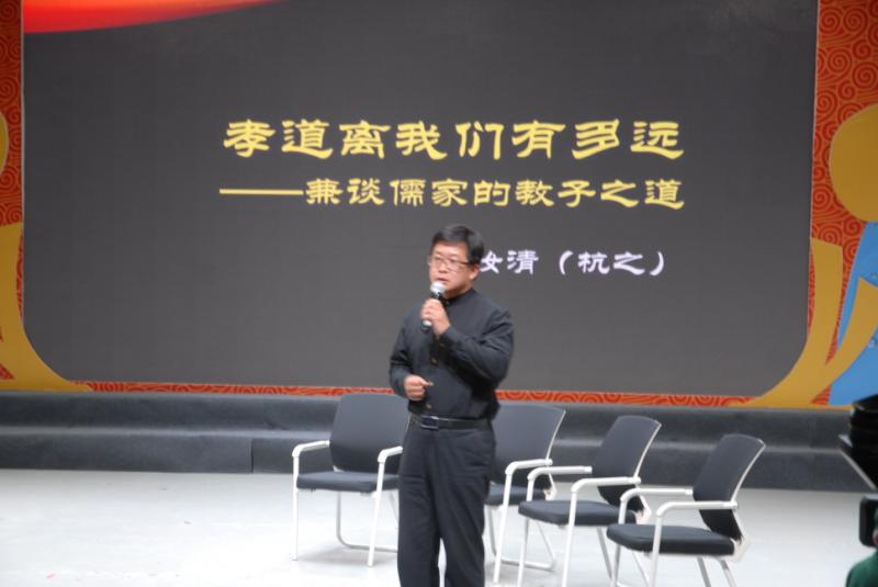 平凉市传统文化促进会“首届优秀传统文化高峰论坛暨传统文化展演活动”于2018年4月15日在平凉电视台演播大厅隆重举行。首场活动由促进会聘请的全国著名学者,苇杭书院山长杨汝清先生作了题为《孝道离我们有多远——兼谈儒家的教子之道》的报告。杨先生的报告从儒家的教子之道——遗子黄金满籝不如一经;孝的概念与百善孝为先;孝道的定义及当今社会条件下践行孝道的方法与途径;孝顺和孝敬的区别与联系;怎样劝谏人们践行孝道;如何正确区分孝与不孝等方面,深刻阐释了孝的真谛与教育子女践行孝道的方法。报告内容充实具体,深入浅出,说理透彻,为听众提供了一场思想意识上的饕餮盛宴。报告结束,全场响起了雷鸣般的掌声。