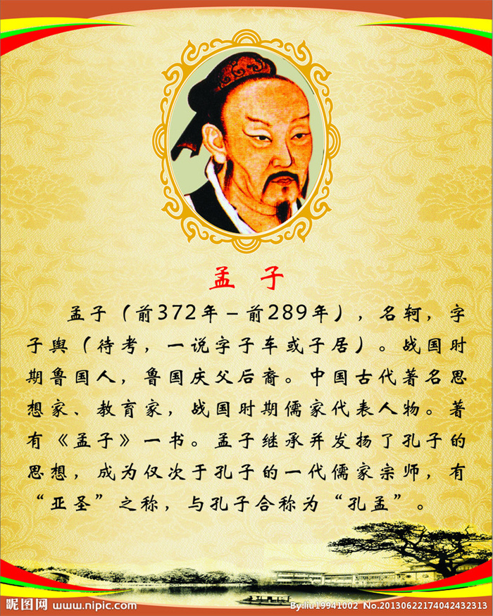 孟子简介(下):孟子早年受业于子思(孔伋,孔子之孙)之门人。他对孔子尊崇备极,是位非常有抱负的政治家。与孔子一样,孟子一生也过着长期的私人讲学生活。中年以后怀着政治抱负,带着学生周游列国,推行他的政治主张,随从学生最盛的时候,是"后车数十乘,从者数百人"。晚年回到故乡,从事教育和著述。