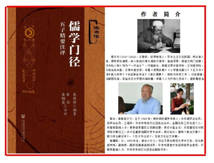 《儒学门径》是秦家三代人不懈努力的重大成果。《五子书》是秦敬修老先生毕其一生对宋代“儒学五子”的著作进行精选和注释的学术成果。之后,他的儿子秦治先生和孙女秦帼英经过长期的整理、编撰,增加了述评,终于完成了这本跨越了新旧两个时代、经过三代人共同努力的《儒学门径•五子精要注评》。这是秦家三代人呕心沥血的成果,是中华优秀传统文化传承与发展的重要成果。