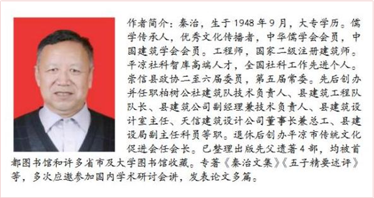 作者简介:秦治,秦敬修次子,生于1948年。有师承的儒学传承人。中华儒学会会员,中国建筑学会会员,工程师。平凉市传统文化促进会会长,全国社科工作先进个人,平凉社科智库高端人才。原崇信县建筑公司副经理,县设计室主任,天信建筑设计院有限公司院长兼总工。多次应邀参加国内学术会讲、研讨会议。著有《秦治文集》《人文指南》《五子精要注评》,发表文化论文多篇。